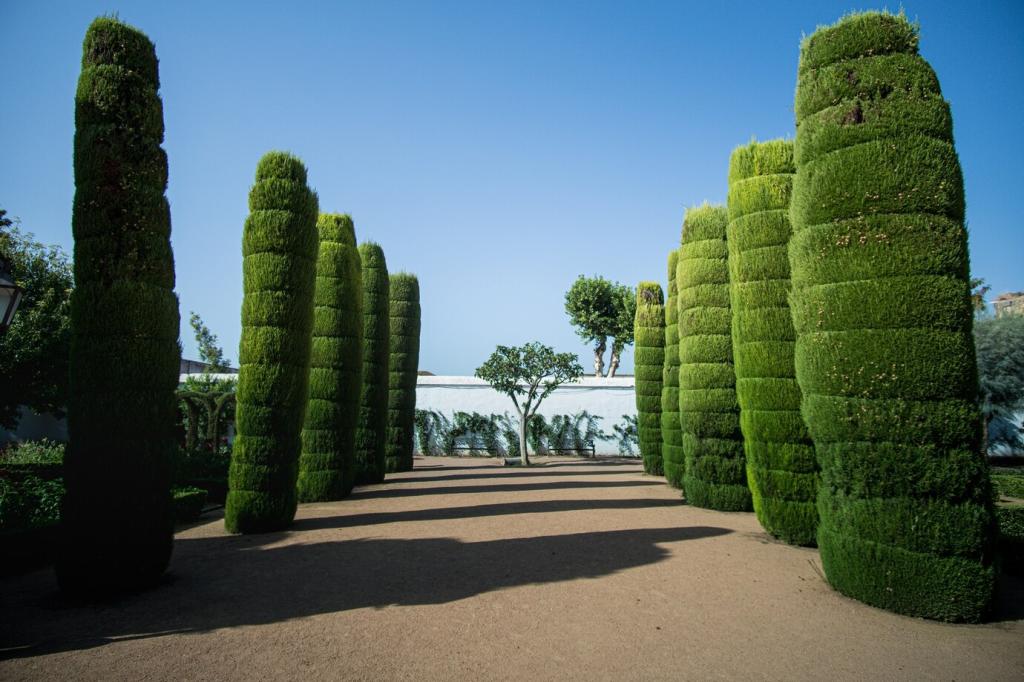 Führe Wege leicht schräg und ordne Pflanzkübel diagonal an. Dieser Trick verlängert Blickachsen, lässt den Raum dynamischer wirken und lenkt die Aufmerksamkeit auf Highlights, statt auf begrenzende Wände oder Geländer.